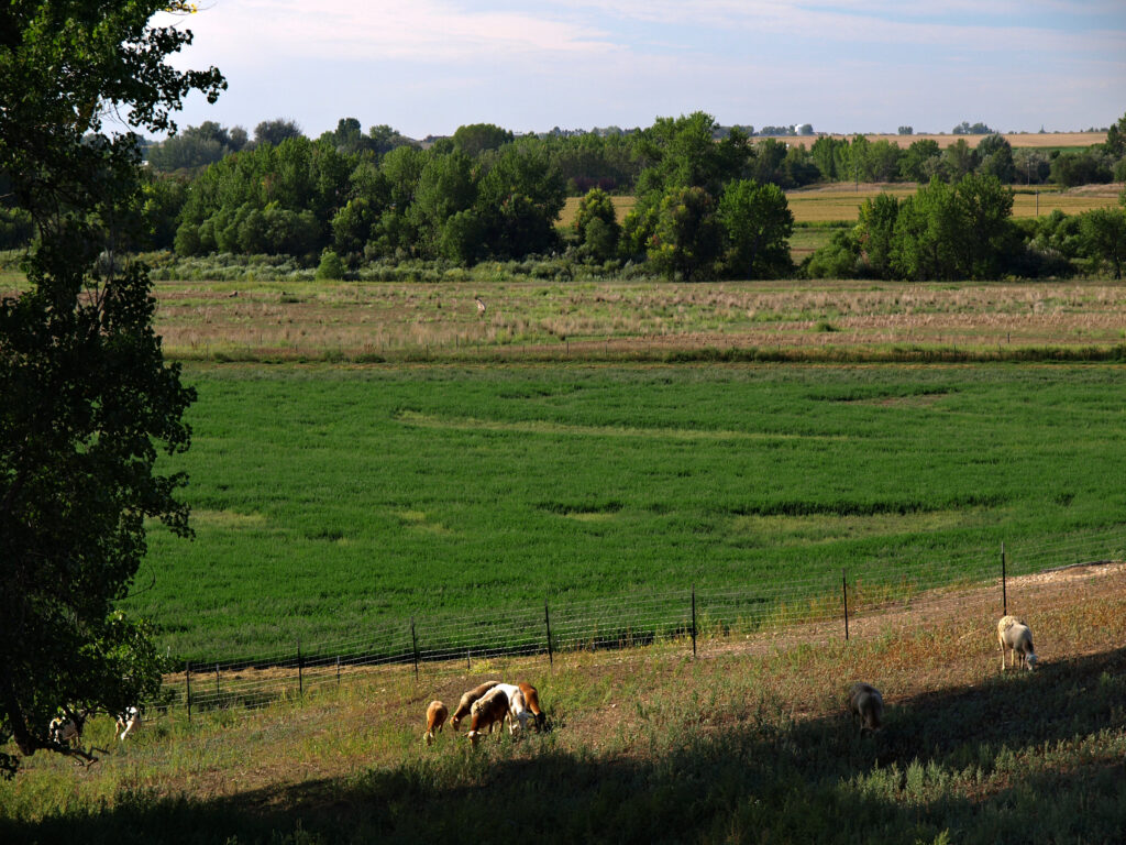 The Cresset Center is located on the historic Henry H. Uhrich Farm, and is being developed in close partnership with the farm’s owners, the Uhrich/Calkins/Burns family, which has owned the property since 1918. The farm includes 120 acres of mixed topography including approximately 60 acres of tillable land, 60 acres of mixed pasture, wetlands, bluffs, beautiful frontage along the Big Thompson River and extraordinary views of the front range. The land has been farmed biodynamically and/or organically for the last 22 years with good soil fertility. Crops grown include rye, barley, corn, alfalfa, hemp and vegetables. The farm also has a small flock of sheep and goats. In 2022 the owners placed a conservation easement on the farm that will protect from development in perpetuity.