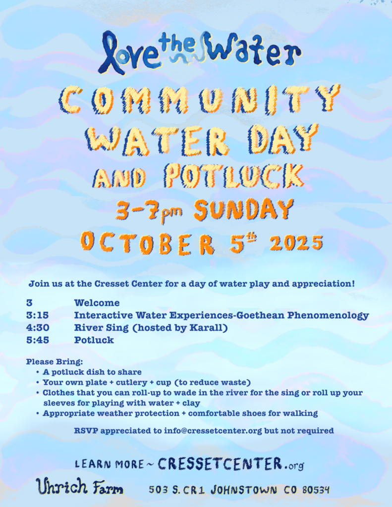 From 2pm to 6pm. We will begin with Goethean water phenomenology which is appropriate for all ages to engage with the wonder of water. Next, we will walk down to the river where Karall will host her River Sing. We will finish the day with a community potluck.